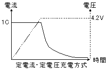 難しそうに考えている人が多いと思いますが、アマチュア的に妥協すれば非常に簡単です。使うのは安定化電源だけ。安定化電源の電圧を4.2Vに設定して電池をつなけばいいだけです。市販のリチウムイオン電池充電回路は定電流・定電圧充電回路と呼ばれており、充電初期は電流一定(およそ1C)で充電し、電池電圧が4.2Vになったら4.2Vの定電圧に切り替えて電流がほぼゼロになれば充電完了です。ですからアマチュア的には充電初期に1C以上流れない程度の電圧に設定し(あまり初期電流がでかいと電池を痛めるおそれがある)、最終的には4.2Vにして半日くらい放置すれば充電できます。定電流部分がないのでジワジワと充電電流が低下するため充電時間が長くなりますが我慢の範囲でしょう。一番いいのは電流容量が1Cくらいの定電圧電源で4.2Vで充電することですね。これだったら電源自体が最大で2.6Aしか流せないので充電初期の過電流を防げます。電流制限がかけられる電源でしたら同様の保護効果があります。