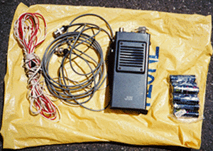 左から、ワイヤーダイポール、ケーブル、ピコ6(50MHz用無線機)、予備の乾電池です。50MHzの山岳移動用としては最軽量ではないでしょうか。
