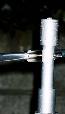 そこで登場したのが左の写真の金具です。そうエレメントクランプです。ポールに穴を空けないと使用できませんが、重量的には半分以下ですみます。(写真のエレメントクランプで50gです)
